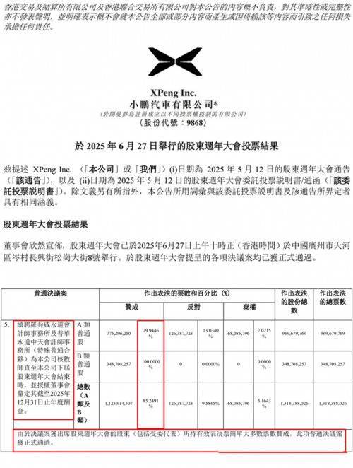 港股上市公司小鹏汽车-W(09868.HK)于2025年6月27日发布的公告显示,公司股东大会已正式通过续聘罗兵咸永道会计师事务所及普华永道中天会计师事务所(特殊普通合伙)为该公司核数师直至该公司下届股东周年大会结束时,并授权董事会厘定其截至2025年12月31日止年度酬金的议案。总计85.25%股东投同意票。