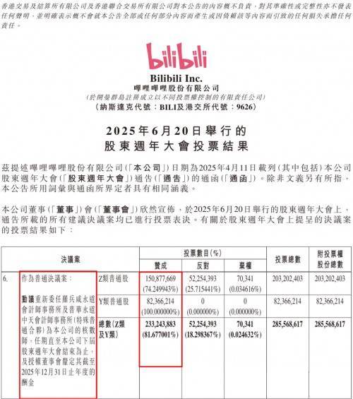 港股上市公司哔哩哔哩-W(09626.HK)于2025年6月20日发布的公告显示,公司股东大会已正式通过重新委任罗兵咸永道会计师事务所及普华永道中天会计师事务所(特殊普通合伙)为该公司的核数师,任期直至该公司下届股东周年大会结束为止,及授权董事会厘定其截至2025年12月31日止年度酬金的议案,总计81.68%股东投同意票。